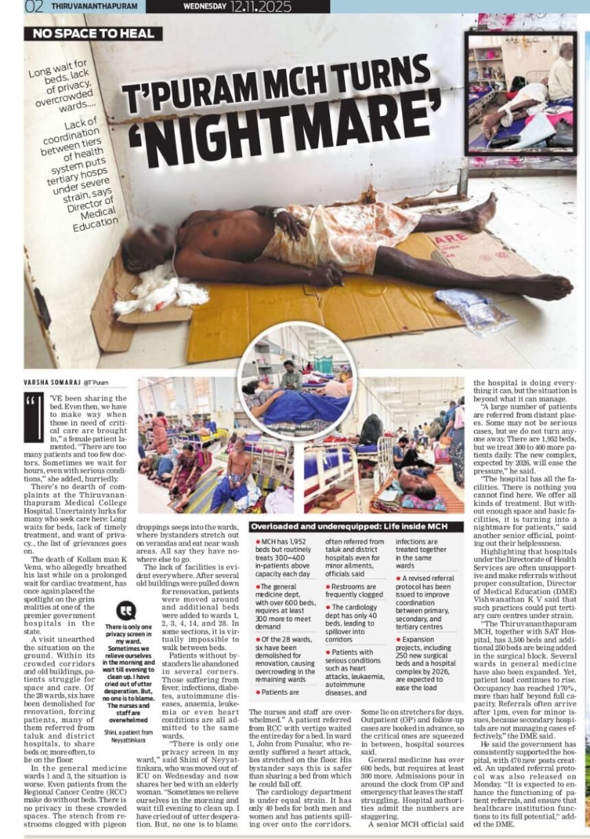തിരുവനന്തപുരം: തിരുവനന്തപുരം മെഡിക്കൽ കോളേജ് ആശുപത്രിയിൽ (MCH) രോഗികളും കൂട്ടിരിപ്പുകാരും കടുത്ത ദുരിതത്തിൽ. ‘നോ സ്പേസ് ടു ഹീൽ’ (No Space to Heal) എന്ന തലക്കെട്ടിൽ ഇന്ന് The New Indian Express പത്രത്തിൽ വന്ന റിപ്പോർട്ട് മെഡിക്കൽ കോളേജ് ദുരിതത്തിൻ്റെ നേർചിത്രം വ്യക്തമാക്കുന്നു. ദീർഘനേരം കാത്തിരിക്കേണ്ടി വരുന്നതും, കിടക്കകളുടെ കുറവും, അമിതമായ തിരക്കും കാരണം രോഗികൾക്ക് ആവശ്യമായ ചികിത്സ കിട്ടാത്ത അവസ്ഥയാണ്. പല വാർഡുകളിലും രോഗികൾ നിലത്തും സ്ട്രെച്ചറുകളിലുമായി കിടക്കുന്നു.