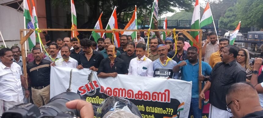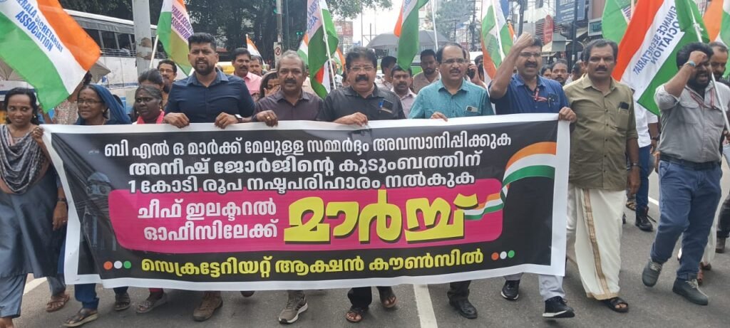 തിരുവനന്തപുരം: ജോലി സമ്മർദ്ദത്താൽ ജീവനൊടുക്കിയ ബി.എൽ.ഒയോട് (ബൂത്ത് ലെവൽ ഓഫീസർ) ഐക്യദാർഢ്യം പ്രകടിപ്പിച്ച്, പ്രതീകാത്മക തൂങ്ങിമരണം ആവിഷ്ക്കരിച്ച് സെക്രട്ടേറിയറ്റ് ആക്ഷൻ കൗൺസിൽ ചീഫ് ഇലക്ടറൽ ഓഫീസിലേക്ക് മാർച്ച് നടത്തി. “എസ്.ഐ.ആർ മരണക്കെണിയാണ്”, “ഇനിയും എത്ര ജീവൻ വേണം, ഒന്ന് കണ്ണ് തുറക്കാൻ?”, “തെരഞ്ഞെടുപ്പ് കമ്മീഷൻ ആരാച്ചാരോ?” തുടങ്ങിയ ചോദ്യങ്ങൾ ഉയർത്തിയായിരുന്നു മഴയത്തും ശക്തമായ പ്രതിഷേധം.