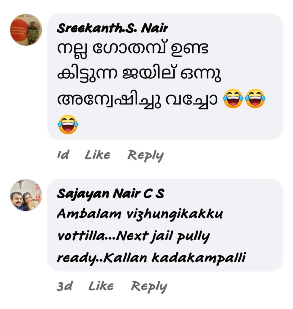 - ”നല്ല ഗോതമ്പ് ഉണ്ട കിട്ടുന്ന ജയില് ഒന്നു അന്വേഷിച്ചു വച്ചോ 😂😂😂”
