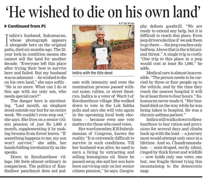 ഇടുക്കി: ഇടുക്കിയിലെ ഒറ്റപ്പെട്ട ചന്ദ്രമണ്ഡലം കോളനിയിൽ ദുരിത ജീവിതം നയിക്കുന്ന ഇന്ദിരയുടെയും മകന്റെയും വാർത്ത പുറത്ത് വന്നതിന് പിന്നാലെ തിരുത്തൽ നടപടികളുമായി റവന്യൂ വകുപ്പ്. ടൈംസ് ഓഫ് ഇന്ത്യ അസിസ്റ്റൻ്റ് എഡിറ്റർ സായി കിരൺ ആണ് ഇവരുടെ ദുരിത ജീവിതം റിപ്പോർട്ട് ചെയ്തത്.