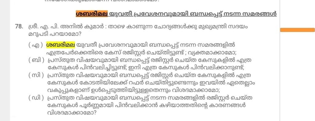 ​യുവതീ പ്രവേശവുമായി ബന്ധപ്പെട്ട് പോലീസ് എടുത്ത കേസുകളുടെ വിശദാംശങ്ങളാണ് നക്ഷത്ര ചിഹ്നമിടാത്ത ചോദ്യങ്ങളായി എ.പി. അനിൽകുമാർ ആവശ്യപ്പെട്ടത്. പഞ്ചായത്ത് തിരഞ്ഞെടുപ്പ് അടുത്തിരിക്കുന്ന സാഹചര്യത്തിൽ ഈ ചോദ്യങ്ങളുടെ ഉത്തരങ്ങൾ പുറത്തു വന്നാൽ അത് സർക്കാരിന് വലിയ തലവേദനയുണ്ടാക്കുമെന്ന ആശങ്കയുള്ളതുകൊണ്ടാണ് മറുപടി നൽകാത്തതെന്നാണ് പ്രതിപക്ഷം കരുതുന്നത്.
