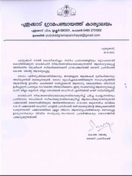 TAGGED: Dengue Fever, Dengue Prevention, Health Alert Kerala, Kerala Health Department, Kerala leader, Pudukad, Pudukad Grama Panchayat, Thrissur News, കെ.ജെ. ജോജു, ഡെങ്കിപ്പനി, പുതുക്കാട് വാർത്തകൾ