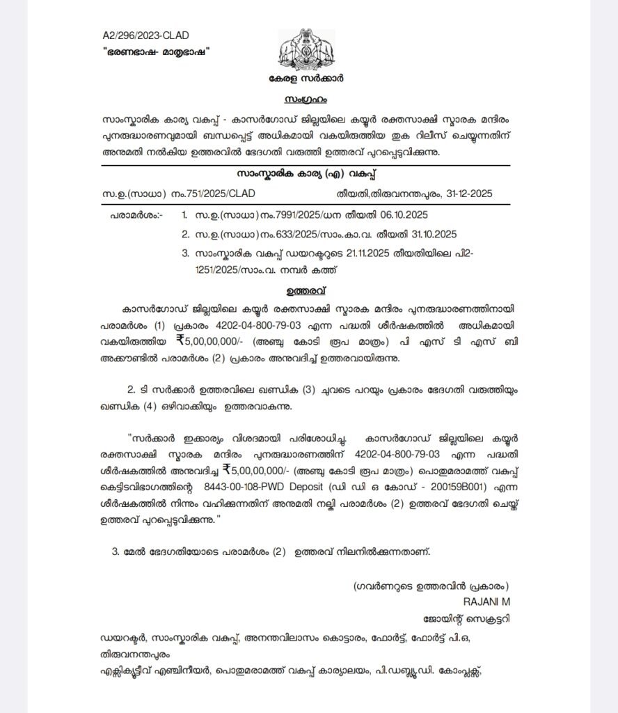 തിരുവനന്തപുരം: സംസ്ഥാനം കടുത്ത സാമ്പത്തിക പ്രതിസന്ധിയിലൂടെ കടന്നുപോകുമ്പോഴും കയ്യൂർ രക്തസാക്ഷി സ്മാരക മന്ദിരത്തിന്റെ പുനരുദ്ധാരണത്തിനായി അഞ്ച് കോടി രൂപ അനുവദിച്ച് സർക്കാർ ഉത്തരവായി. ട്രഷറി നിയന്ത്രണങ്ങൾ കർശനമായി തുടരുന്നതിനിടയിലാണ് സാംസ്കാരിക വകുപ്പ് പണം അനുവദിച്ചുകൊണ്ട് ഡിസംബർ 31-ന് ഉത്തരവിറങ്ങിയത്.