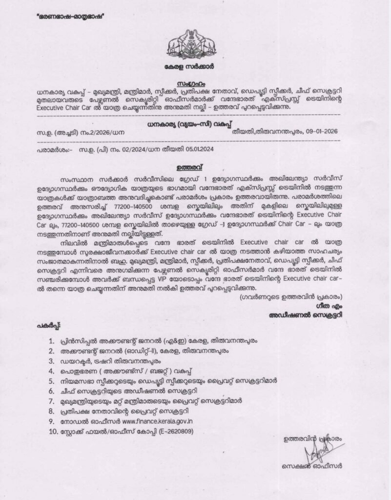 TAGGED: CM Pinarayi Vijayan, Executive Chair Car, finance department kerala, Kerala Government Order, Kerala leader, Kerala Ministers, Personal Security Officers, Security Protocol, Vande Bharat Express