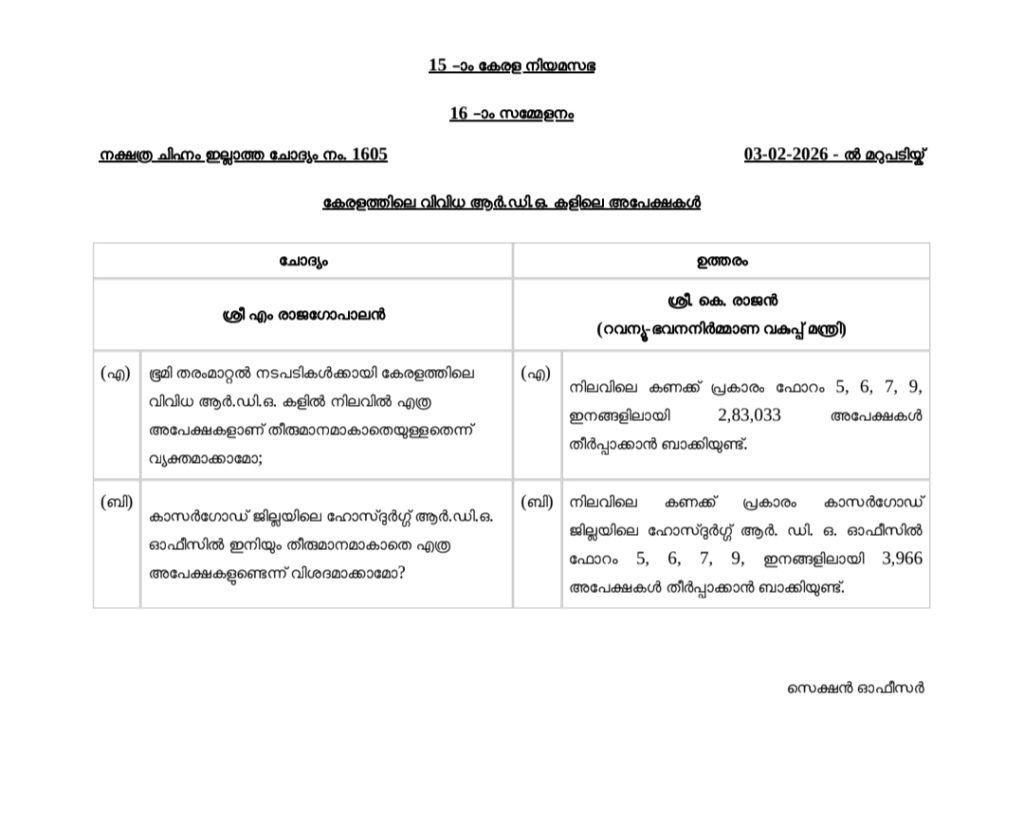 റവന്യൂ വകുപ്പിന്റെ കാര്യക്ഷമതയെ ചോദ്യം ചെയ്യുന്ന ഈ കണക്കുകൾ സർക്കാരിന് വരും ദിവസങ്ങളിൽ വലിയ രാഷ്ട്രീയ വെല്ലുവിളിയാകുമെന്ന് ഉറപ്പാണ്.