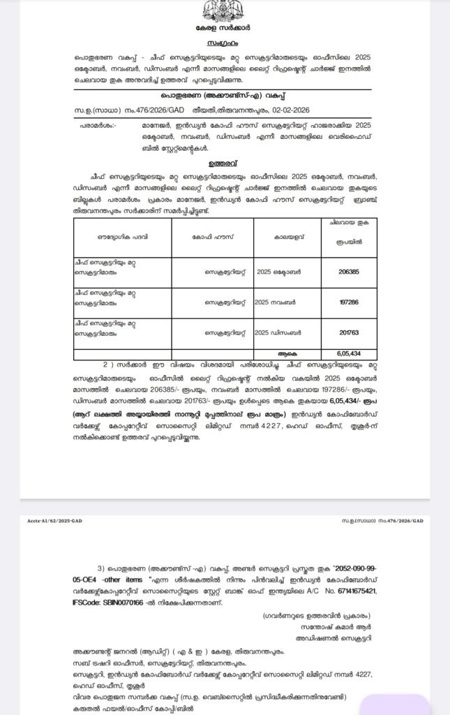 ​സെക്രട്ടറിയേറ്റിനുള്ളിലെ ഇന്ത്യൻ കോഫി ഹൗസിൽ നിന്നാണ് ജയതിലകും മറ്റ് ഐ എ എസുകാരും ലഘു ഭക്ഷണം എത്തിച്ചിരുന്നത്. 2025 ഒക്ടോബർ, നവംബർ, ഡിസംബർ മാസങ്ങളിലെ ബില്ലാണ് ഇപ്പോൾ വിവാദമായിരിക്കുന്നത്.