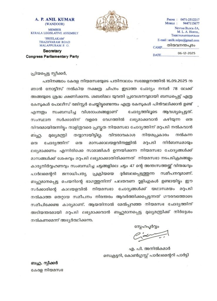കഴിഞ്ഞ സെപ്റ്റംബർ 16-ന് പതിനാലാം നിയമസഭാ സമ്മേളനത്തിലാണ് എ.പി. അനിൽകുമാർ എം.എൽ.എ ശബരിമല കേസുകളെക്കുറിച്ച് ചോദ്യമുന്നയിച്ചത്. എന്നാൽ മറുപടി നൽകാതെ മുഖ്യമന്ത്രി ഒളിച്ചുകളിക്കുകയായിരുന്നു. ഇതിനെതിരെ ഡിസംബർ 6-ന് അനിൽകുമാർ സ്പീക്കർക്ക് പരാതി നൽകി. ഈ രണ്ടു ദിവസം മുൻപ് മുഖ്യമന്ത്രി നൽകിയ മറുപടി നിയമസഭ വെബ്സൈറ്റിൽ അപ്ലോഡ് ചെയ്തിട്ടുണ്ട്.