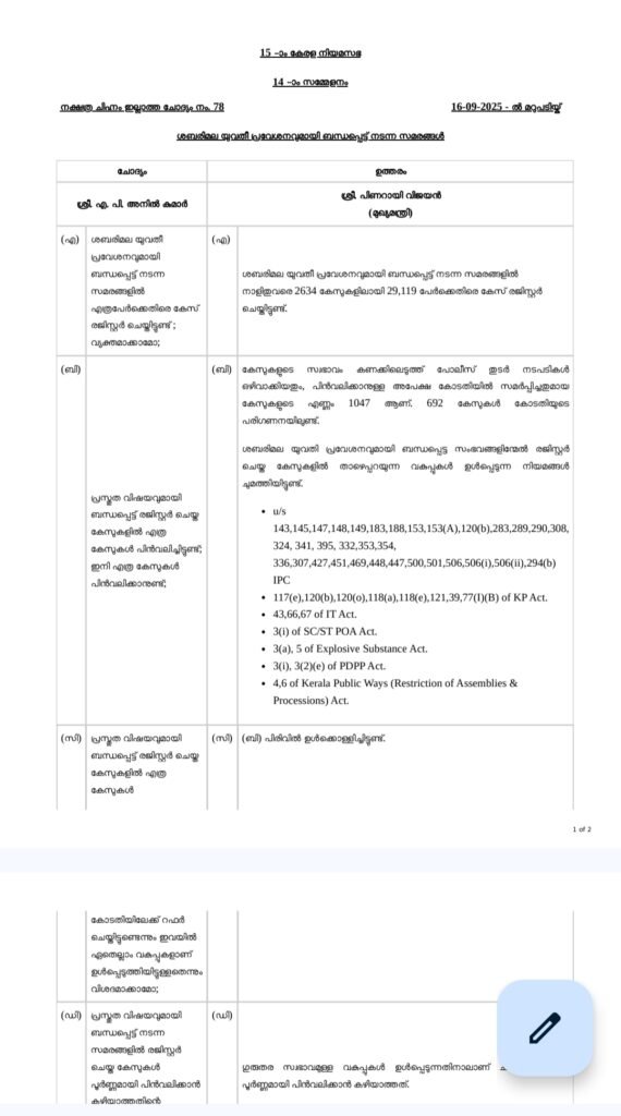 2021 ഫെബ്രുവരിയിൽ ശബരിമല, പൗരത്വ നിയമ പ്രക്ഷോഭ കേസുകൾ പിൻവലിക്കുമെന്ന് സർക്കാർ ഔദ്യോഗികമായി ഉത്തരവിറക്കിയിരുന്നു. എന്നാൽ അഞ്ച് വർഷം പിന്നിടുമ്പോഴും പകുതിയിലധികം കേസുകൾ ഇപ്പോഴും നിയമക്കുരുക്കിൽ തന്നെയാണെന്ന് മുഖ്യമന്ത്രിയുടെ പുതിയ മറുപടി തെളിയിക്കുന്നു. ഗുരുതരമല്ലാത്ത കേസുകൾ പിൻവലിക്കുമെന്നായിരുന്നു അന്ന് സർക്കാർ നൽകിയ ഉറപ്പ്. എന്നാൽ ആയിരക്കണക്കിന് സാധാരണക്കാർ ഇന്നും കോടതികൾ കയറിയിറങ്ങേണ്ടി വരുന്ന അവസ്ഥയിലാണ്.