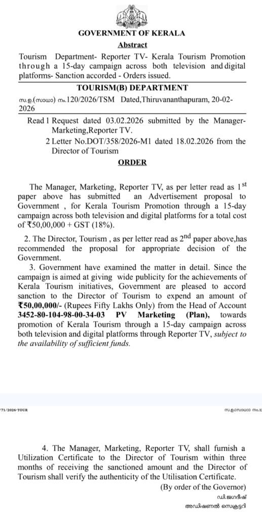 - ഫെബ്രുവരി 3: കേരള ടൂറിസത്തെക്കുറിച്ച് 15 ദിവസത്തെ ക്യാമ്പയിൻ നടത്താൻ 50 ലക്ഷം രൂപ ആവശ്യപ്പെട്ട് റിപ്പോർട്ടർ ടി.വി ടൂറിസം ഡയറക്ടർക്ക് പ്രൊപ്പോസൽ നൽകുന്നു.