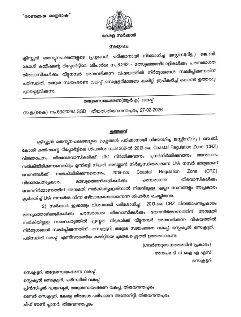 2019-ലെ കോസ്റ്റൽ റെഗുലേഷൻ സോൺ (CRZ) വിജ്ഞാപനം പ്രകാരം തീരദേശവാസികൾക്ക് വീട് നിർമ്മിക്കാനും പഴയവ പുനർനിർമ്മിക്കാനും അനുവാദമുണ്ട്. എന്നാൽ, സാങ്കേതിക തടസ്സങ്ങൾ ചൂണ്ടിക്കാട്ടി ഇത്തരത്തിൽ നിർമ്മിക്കുന്ന ഭവനങ്ങൾക്ക് തദ്ദേശ സ്ഥാപനങ്ങൾ സ്ഥിരമായ വീട്ടുനമ്പറിന് പകരം U/A (Un-Authorized) നമ്പറുകളാണ് നൽകുന്നത്.
