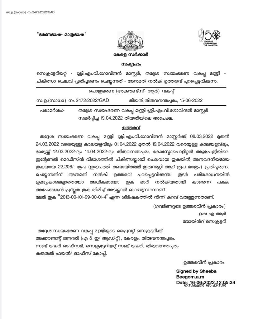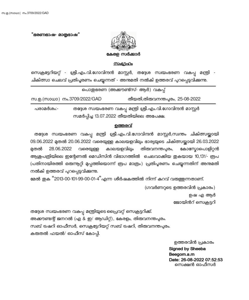 - പി.കെ. ശ്യാമള: 2022 ജൂലൈ 14 മുതൽ ജൂലൈ 21 വരെയും, മാർച്ച്, ഏപ്രിൽ മാസങ്ങളിലും കോസ്മോ ആശുപത്രിയിൽ ചികിത്സ നടത്തി.