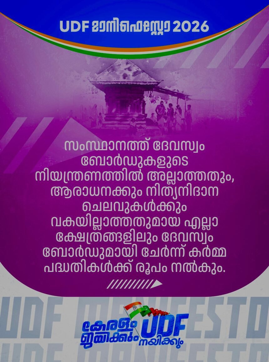 കൊച്ചി: സംസ്ഥാനത്തെ ദേവസ്വം ബോർഡുകളുടെ നിയന്ത്രണത്തിലല്ലാത്തതും സാമ്പത്തികമായി പിന്നോക്കം നിൽക്കുന്നതുമായ ക്ഷേത്രങ്ങളുടെ ഉന്നമനത്തിനായി പ്രത്യേക കർമ്മപദ്ധതികൾ ആവിഷ്കരിക്കുമെന്ന് യുഡിഎഫ് പ്രഖ്യാപിച്ചു.