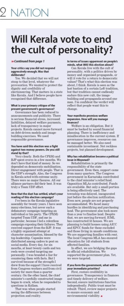 TAGGED: Kerala Election, Kerala leader, Kerala Politics, National Herald, UDF, V.D. Satheesan, കേരള നിയമസഭാ തെരഞ്ഞെടുപ്പ്, കേരള രാഷ്ട്രീയം, കോൺഗ്രസ്, പിണറായി വിജയൻ, യുഡിഎഫ്, വി.ഡി. സതീശൻ, വി.ഡി. സതീശൻ അഭിമുഖം, വ്യക്തിപൂജ