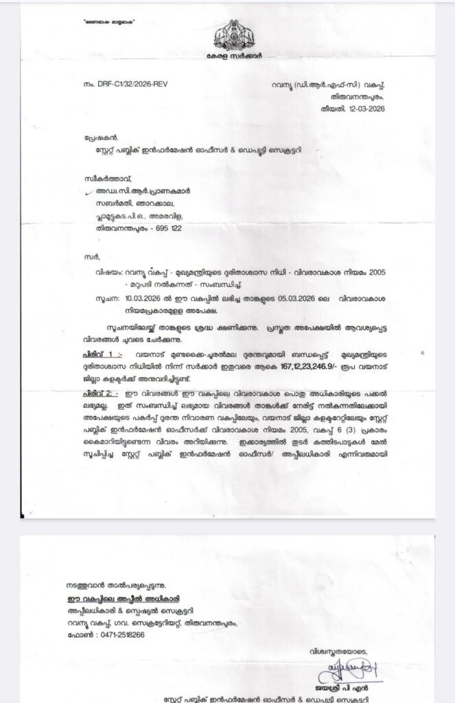 ​മുഖ്യമന്ത്രിയുടെ ദുരിതാശ്വാസ നിധിയിലേക്ക് (CMDRF) ലോകമെമ്പാടുമുള്ള മലയാളികൾ നൽകിയ തുകയിൽ നിന്ന് 167,12,23,246.9 രൂപ (ഏകദേശം 167 കോടി) വയനാട് ജില്ലാ കളക്ടർക്ക് അനുവദിച്ചതായി റവന്യൂ വകുപ്പിന്റെ രേഖകൾ വ്യക്തമാക്കുന്നു. ജനങ്ങൾ സ്വമനസ്സാലെ നൽകിയ ഈ കോടിക്കണക്കിന് രൂപയുടെ വിനിയോഗത്തിലും കൂടുതൽ സുതാര്യത വേണമെന്ന ആവശ്യം ശക്തമാണ്.